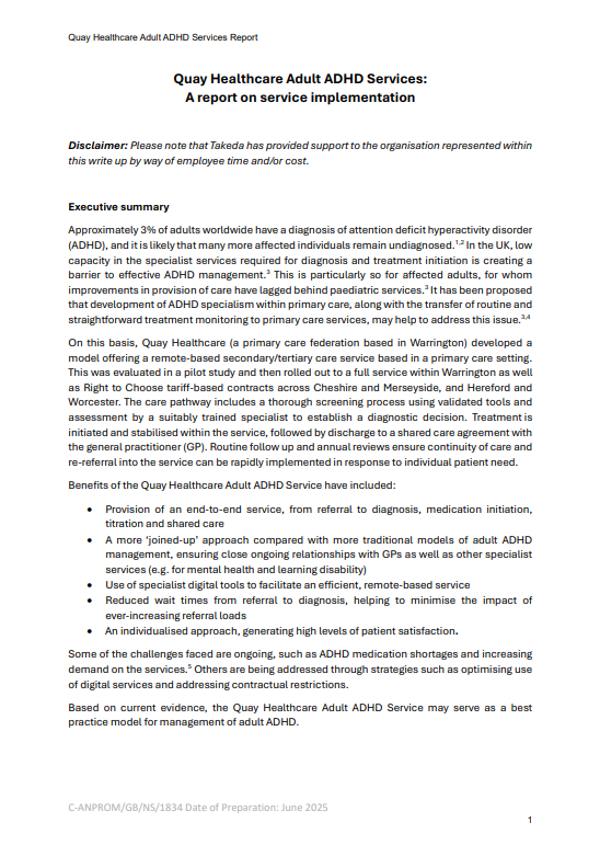 The Quay Healthcare Adult ADHD Services report details a remote-based care model integrated into primary care to improve adult ADHD management in the UK, supported by Takeda. This model, piloted in Warrington and expanded across several regions, aims to enhance diagnosis and treatment, reduce wait times, and increase patient satisfaction by combining specialist and primary care. Despite challenges and increasing demands, the service is viewed as a potential best practice for managing adult ADHD.